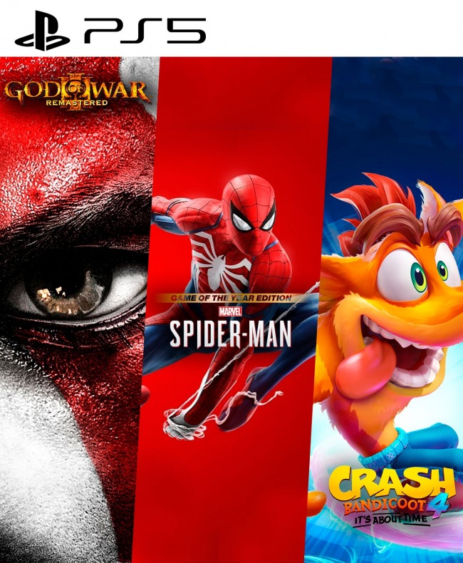 3 juegos en 1 God of war III mas Marvels Spider Man Game of the Year Edition mas Crash Bandicoot 4 Its About Time PS5
